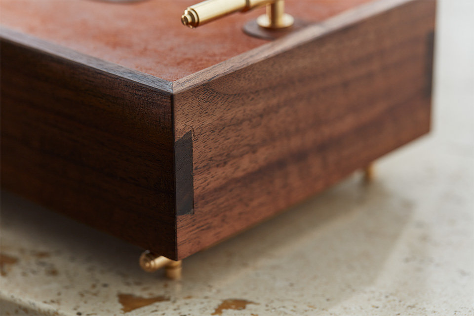 オレンジのレザーと相性の良いウォールナット材を使用しています。日本三大銘木家具産地のひとつ、福岡県大川市の熟練の家具職人が手掛ける本製品は、日本の伝統的な木工技法のひとつで、金物を使わずに木と木を強固に接合する「蟻組み」という方法を取り入れた精巧な仕上がり。