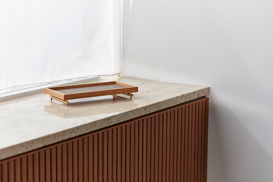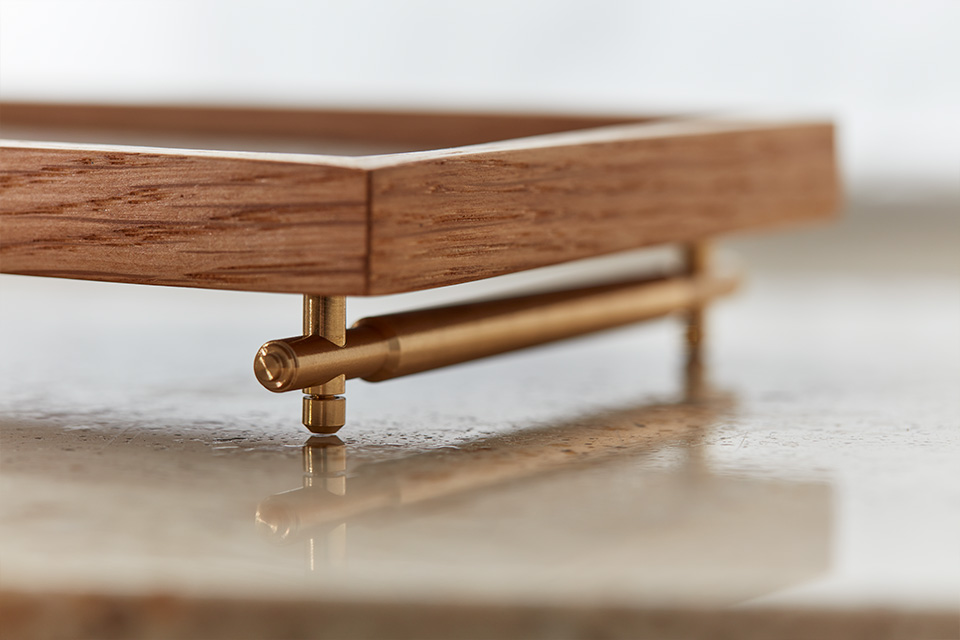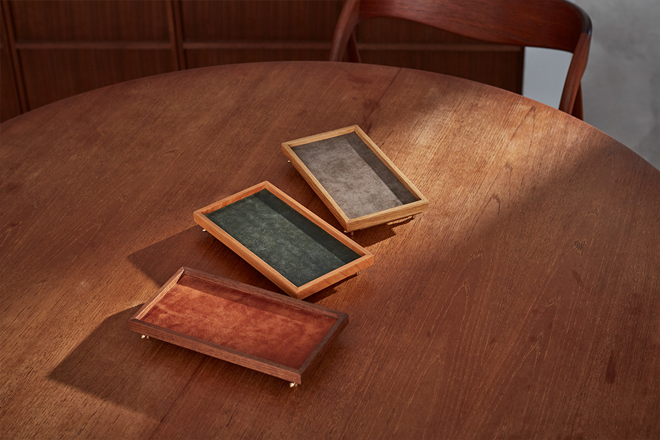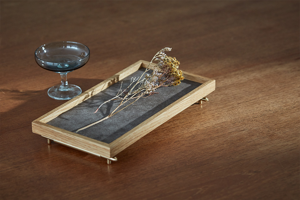 ウッド×レザー×真鍮の素材の掛け合わせが美しいトレー。
