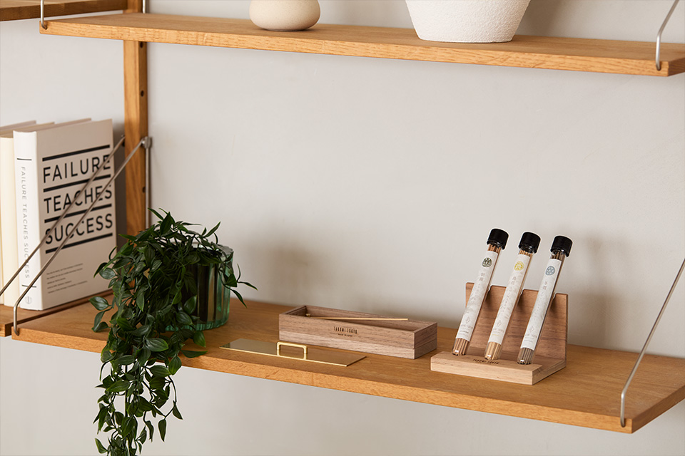その日の気分で手に取りやすいスタンドは、お香立てと同じナチュラルな色味でインテリアと自然に馴染みます。