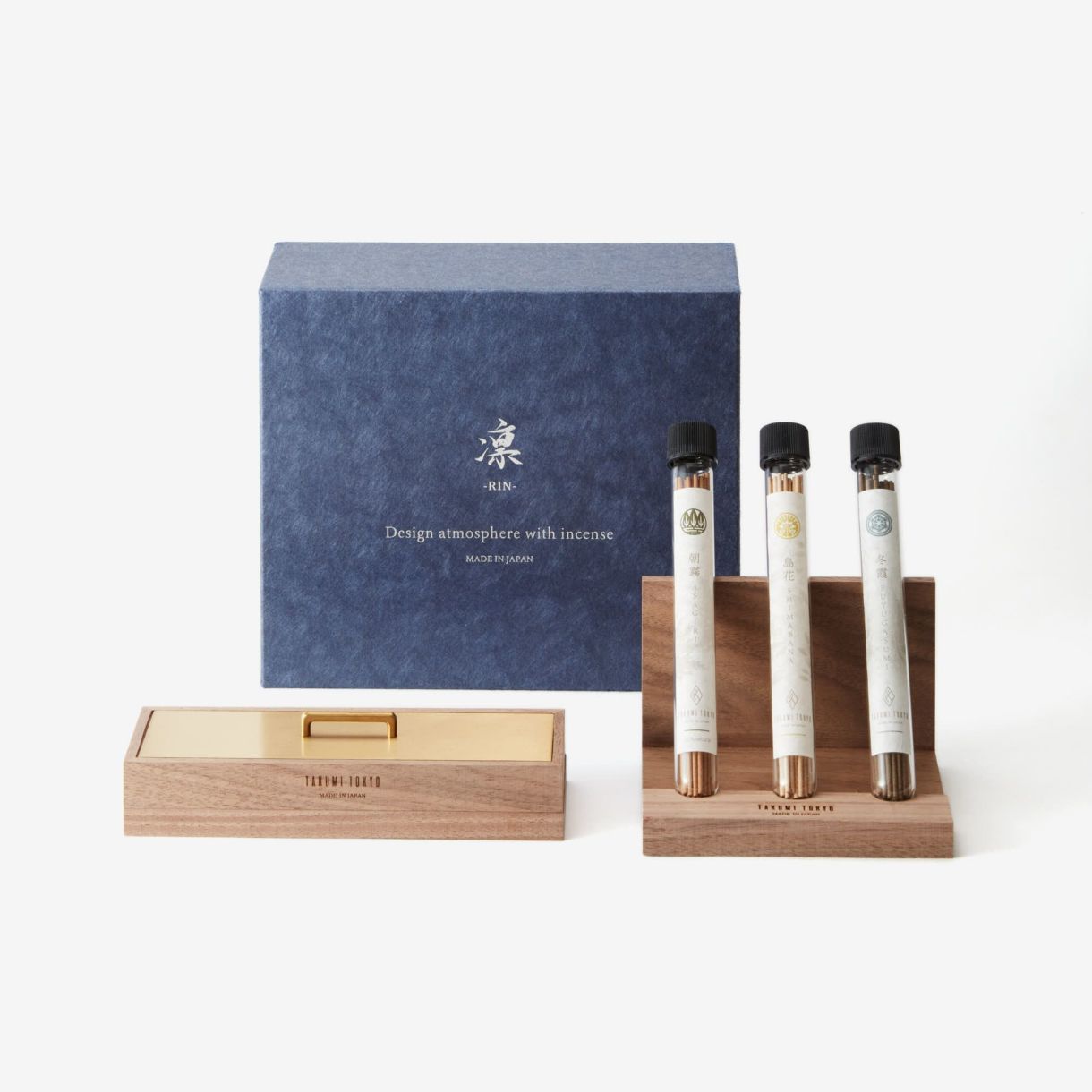 お香は世界各地から取り寄せた香料をブレンドして群馬県水上町の森の中で制作されています。「朝霧」「島花」「冬霞」の三種類をお楽しみください。